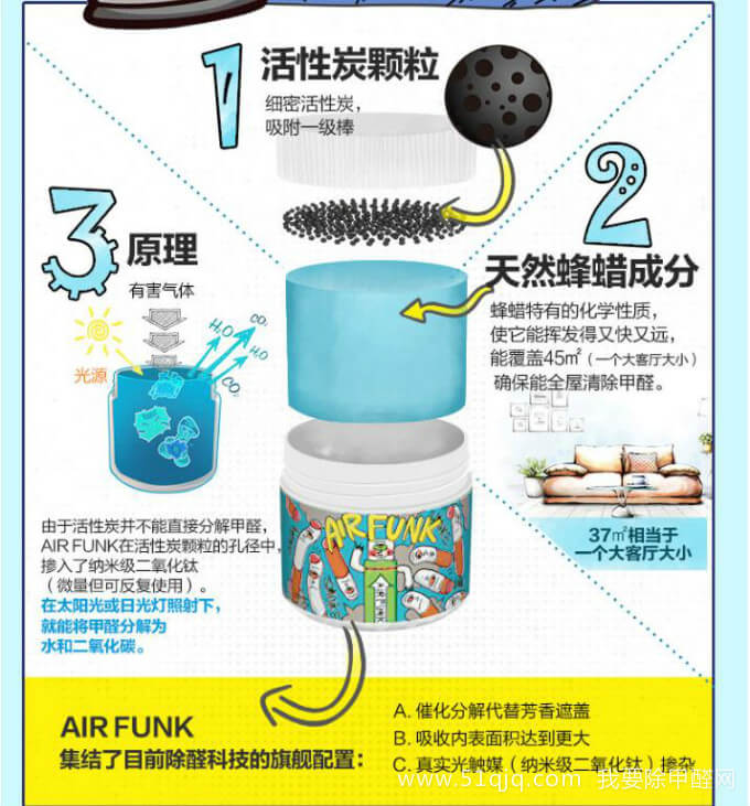小编在文章【活性炭能除甲醛吗看科学试验结论】中介绍到活性炭是具有一定除甲醛功能的,并且增大活性炭表面积可有效提高吸附效果,在“airfunk”光触媒甲醛清除剂这款产品中采用的就是粉化的细密活性炭,这对提高甲醛吸附性是由一定效果的。