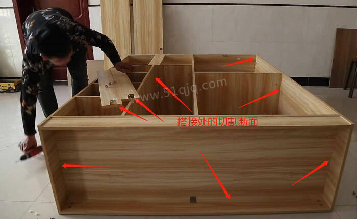 瞧瞧,这就是不监工或不注重这些细节而让家具生产商钻了空子,而这些裸露的断面正是甲醛释放出口,在未来3-15年陆续会有甲醛沿着这些界面缓慢时放出了。如果室内这类家具多了很容易造成甲醛超标,给家人身体健康带来危害。