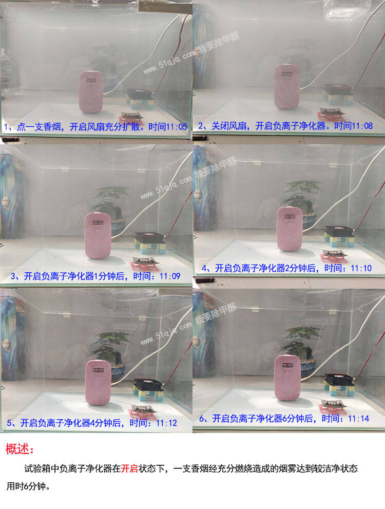 从上述组图可以直观看出,实验舱内的香烟烟雾净化效果明显,从开启负离子净化器到达到洁净状态用时6分钟。