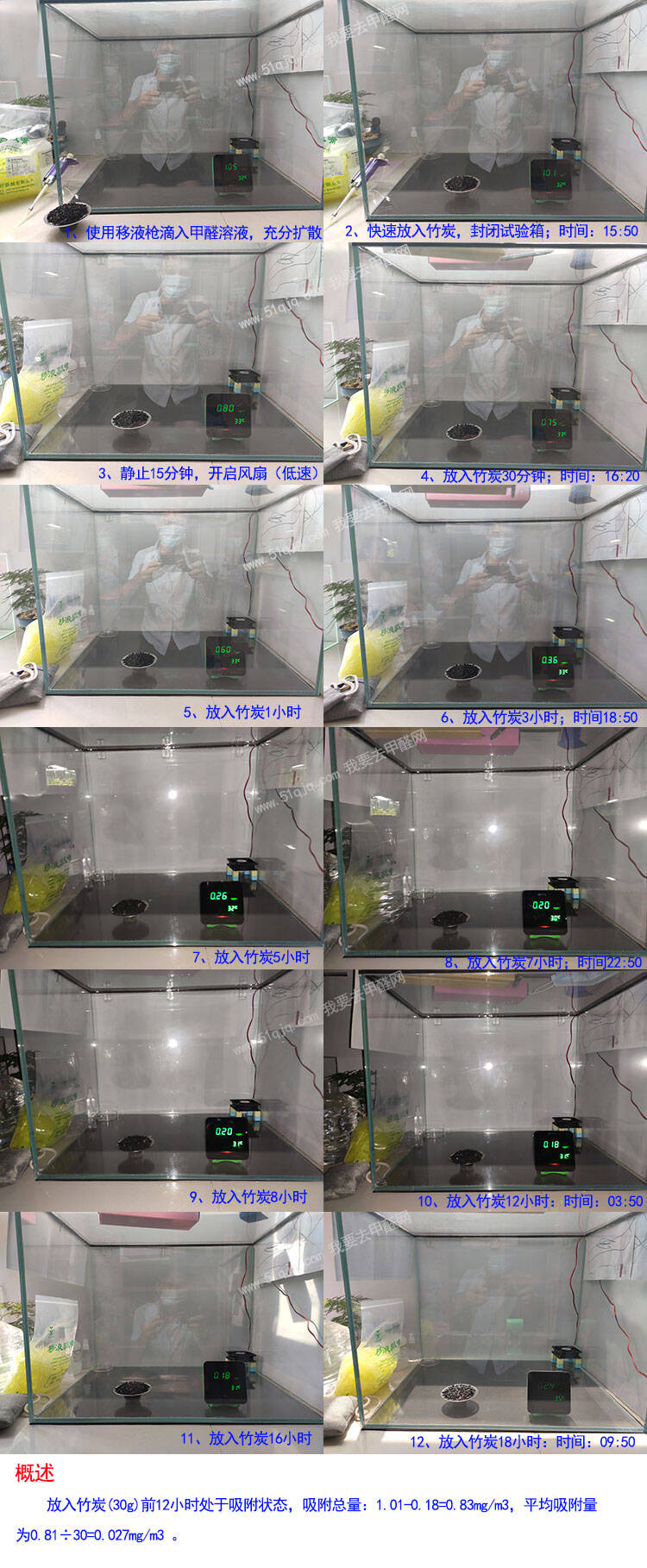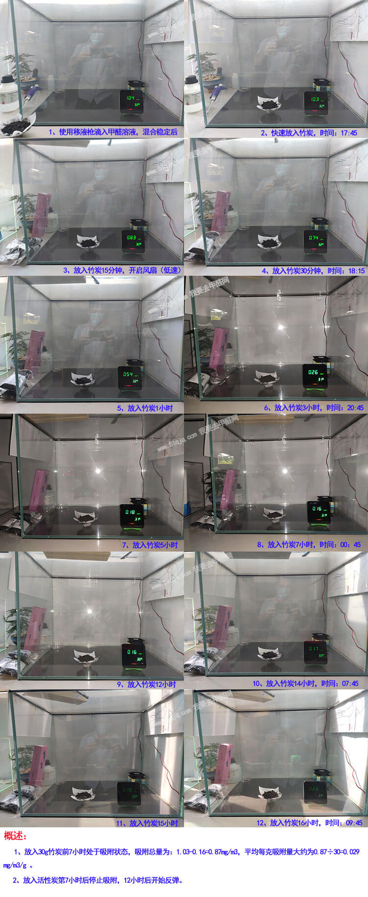 同样先称重30g竹炭,然后进行除甲醛试验,整个试验过程组图见下图: