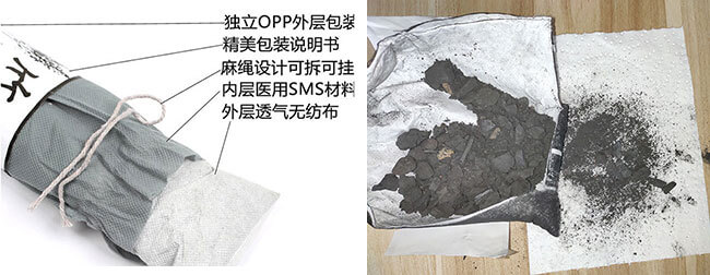 外边采用透气的麻布袋包装,内部使用无纺布装着竹炭,竹炭颗粒较大但较轻。