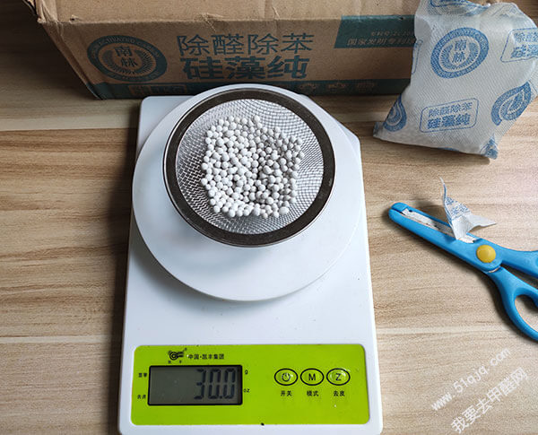 2-2、待甲醛检测仪结果基本稳定后快速放入称好的30g南林硅藻纯;