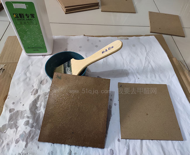 1、将一块5MM厚密度板一分为二,1块留作空白对比试样,标记为“2”,另1块(标记为“2-1”)涂刷奥因除醛专家甲醛清除剂3遍,每涂刷完一遍放置阳台风口晾干,表面恢复原板颜色后再涂刷下一遍(见上图)。