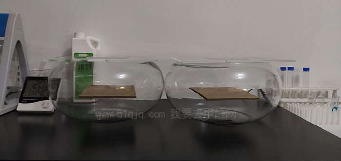 2、将干燥后的两块对比试板分别放在两个玻璃缸中,然后封闭放置恒温箱中,恒温28℃,封闭12个小时(见上图)