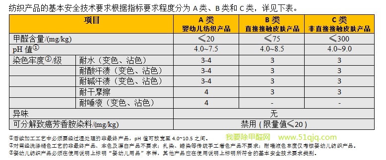 从标准中可以看到,纺织产品的基本安全技术要求首先控制的是甲醛含量,作为纺织产品有害物质控制的第一类指标。