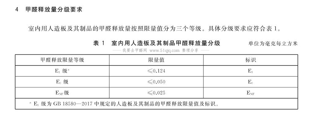 在标准GB/T 39600-2021《人造板及其制品甲醛释放量分级》规定了不同等级人造板的甲醛释放量:
