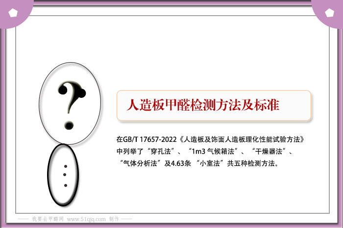 在GB/T 17657-2022《人造板及饰面人造板理化性能试验方法》中列举了五种甲醛检测方法,分别是4.59条 “穿孔法”、4.60条 “1m³ 气候箱法”、4.61条 “干燥器法”、4.62条 “气体分析法”及4.63条 “小室法”。