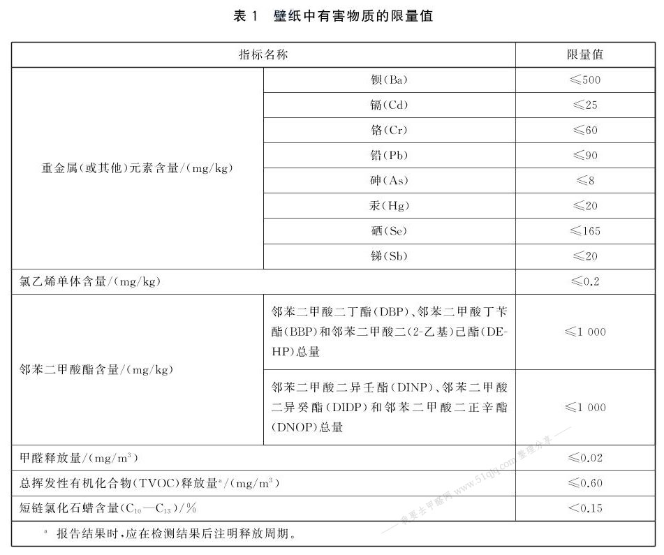 在标准GB 18585-2023《室内装饰装修材料 壁纸中有害物质限量》中明确规定了上述污染物的限量要求,见下图: