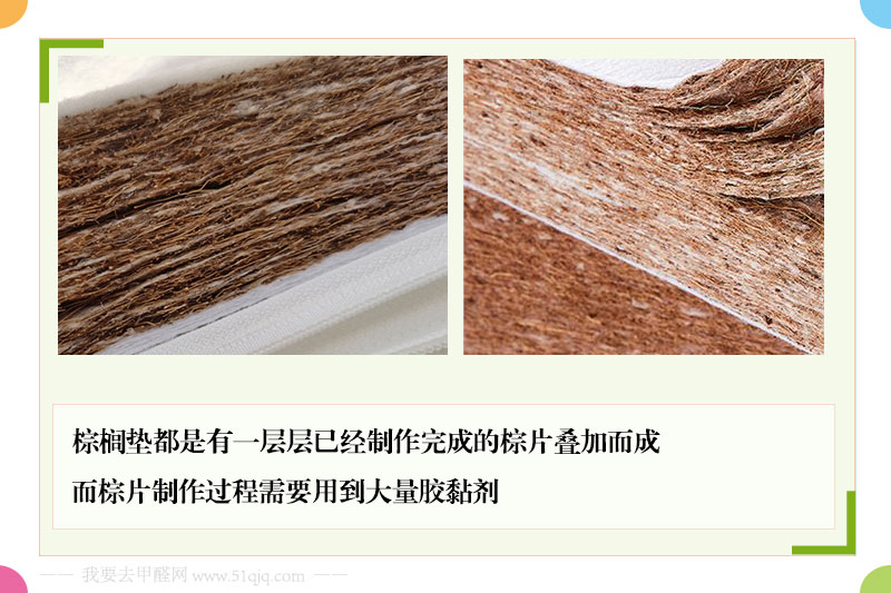 成片环节为了使棕丝粘连富有弹性必须喷涂大量胶黏剂,而优质的棕垫都会采用天然的乳胶漆,如果选用环保胶黏剂并规范生产其甲醛含量是达标的。但一些不良商家为了追求利益往往使用劣质胶黏剂如:脲醛树脂,这就造成生产出来的棕榈垫甲醛含量远远超出国家标准规定,危害使用者身体健康。