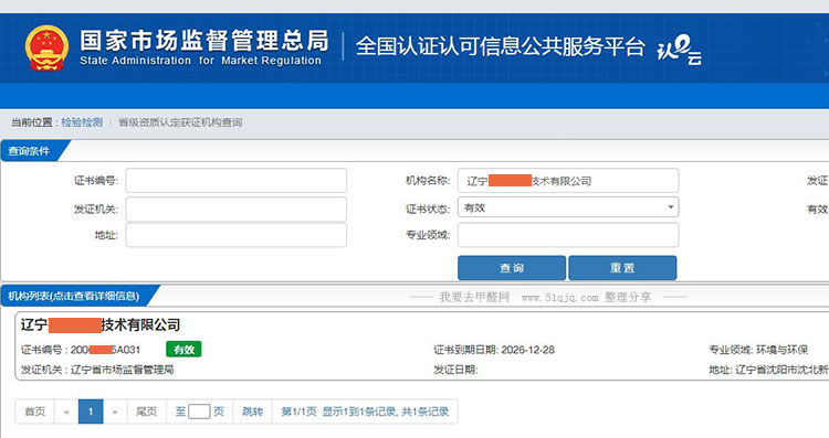 查询方法:打开辽宁省市场监督管理局一体化行政许可平台→检验检测机构资质认定公示查询→在查询界面输入要查询的机构名称或CMA认证编号即可。