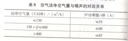 表8空气洁净空气量与噪声的对应关系